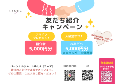 LAMUAの5,000円お得になるご紹介キャンペーン★ date:2025.07.10 【ご紹介キャンペーン実施中】 お得に、安心して始められるダイエットサポート。 いつもLAMUAをご利用いただきありがとうございます。 現在、LAMUAでは【友だち紹介キャンペーン】を実施中です。