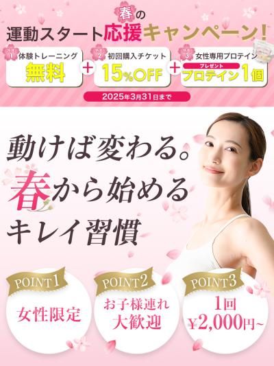 春の運動スタート応援キャンペーン☆ date:2025.03.05 【春の運動スタート応援キャンペーン!】 春は新しいことを始めるのにぴったりの季節! 「運動を始めたいけれど、 なかなか一歩が踏み出せない…」 そんなあなたを応援するために、 特別なキャ...続きをみる