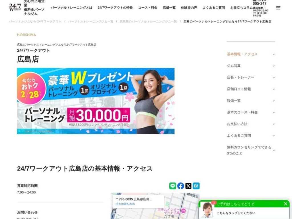 | 公式サイトURL | https://247-sports.jp/workout/gym/hiroshima/hiroshima/ |