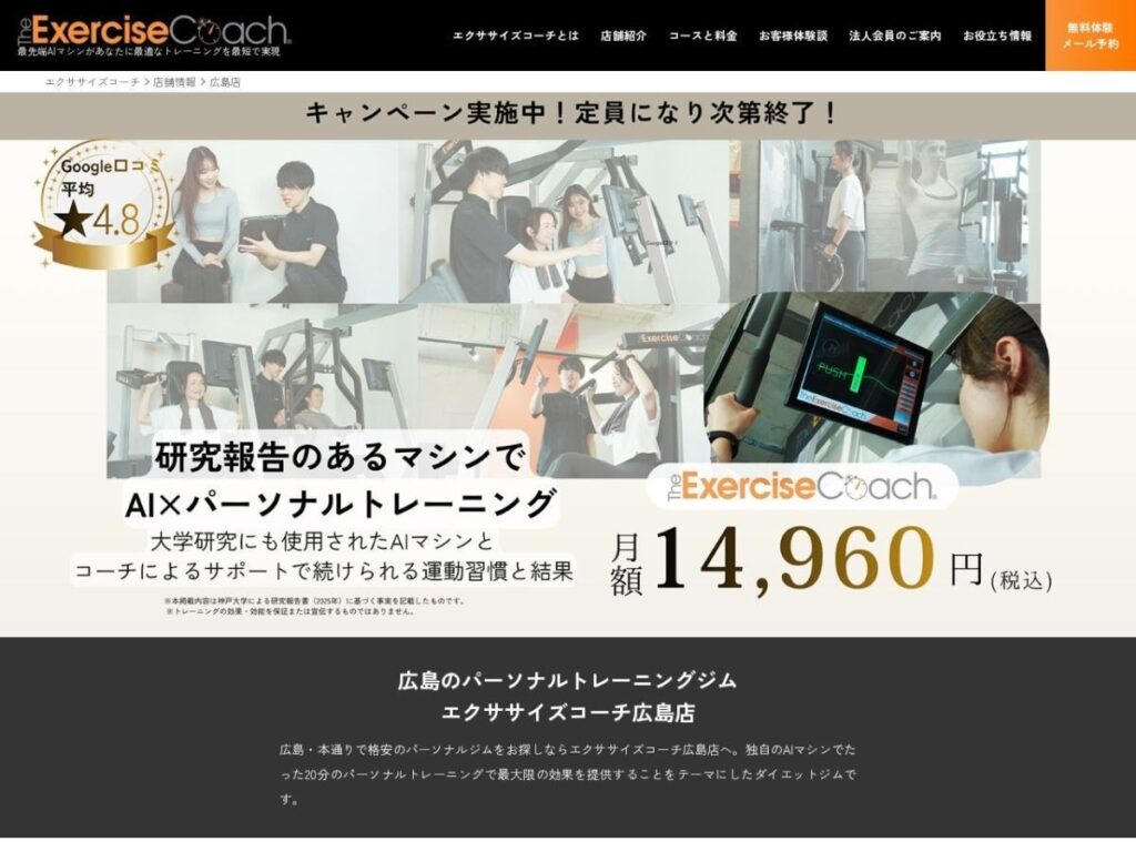 | 公式サイトURL | https://exercisecoach.co.jp/store/hiroshima/ |