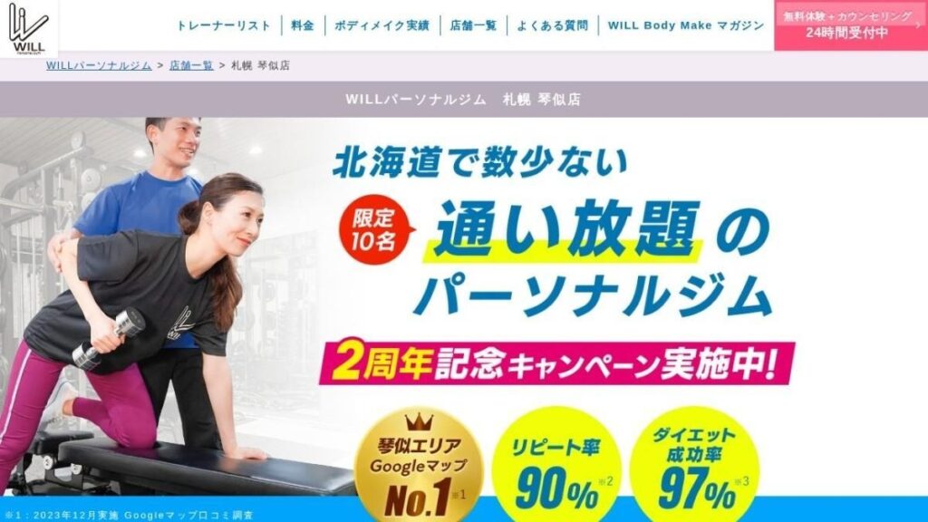 | 公式サイトURL | https://www.willgym.jp/store/sapporo-kotoni/ |