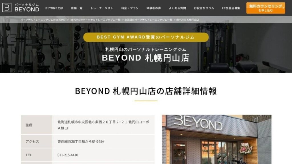 | 公式サイトURL | https://beyond-gym.com/gym/gym-sapporo-maruyama/ |