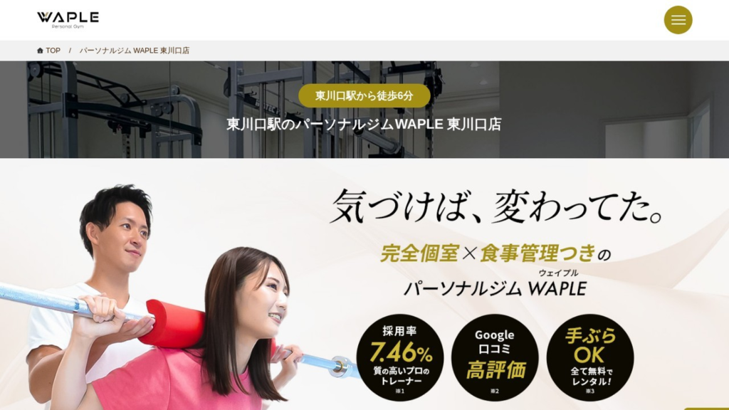 WAPLE(ウェイプル)東川口店は、東川口駅 徒歩6分で通いやすいパーソナルジムです。料金の目安は「月4回 39,160円/月8回 69,520円/月12回 99,000円(各50分・税込)」で、営業時間は9:00-23:00です。