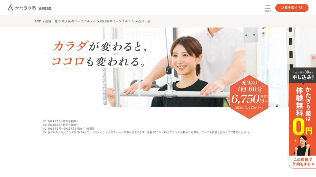 かたぎり塾 西川口店は、西川口駅 徒歩1分(東川口から電車で移動可)で通いやすいパーソナルジムです。料金の目安は「月4プラン 33,000円/月8プラン 59,400円(税込)」で、営業時間は要確認です。