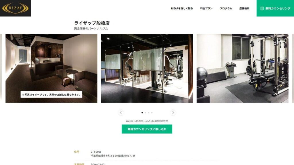 | RIZAP千葉店 | 55,000円 | BASIC 2ヶ月16回 327,800円BASIC 3ヶ月24回 491,700円 | 50分 | 無料カウンセリング | 葭川公園駅 徒歩2分 |