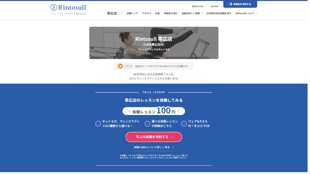 Rintosull 帯広店5,000円→体験当日0円月4回 8,800円通い放題 10,800円全店通い放題 16,800円※管理費680円/月マシングループ100円WOW帯広1F駐車場あり