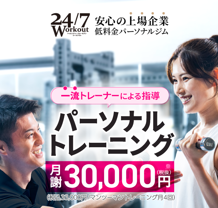 24/7ワークアウト熊本店は、ライザップと並ぶ全国展開の大手パーソナルジムです。熊本店は上通町に位置し、朝7時から夜24時まで営業しているため仕事で忙しい方でも通いやすいのが強みです。