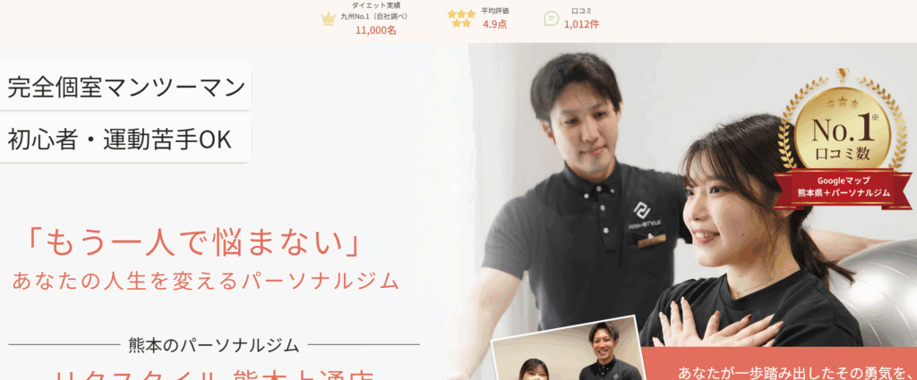 RITA-STYLE熊本上通店は、熊本発祥で九州を中心に展開する人気パーソナルジムです。上通アーケード内にあり、通いやすさは抜群。女性に特に支持されており、「 すべての女性におすすめ! 」と評される短期集中ダイエットプログラムが強みです。