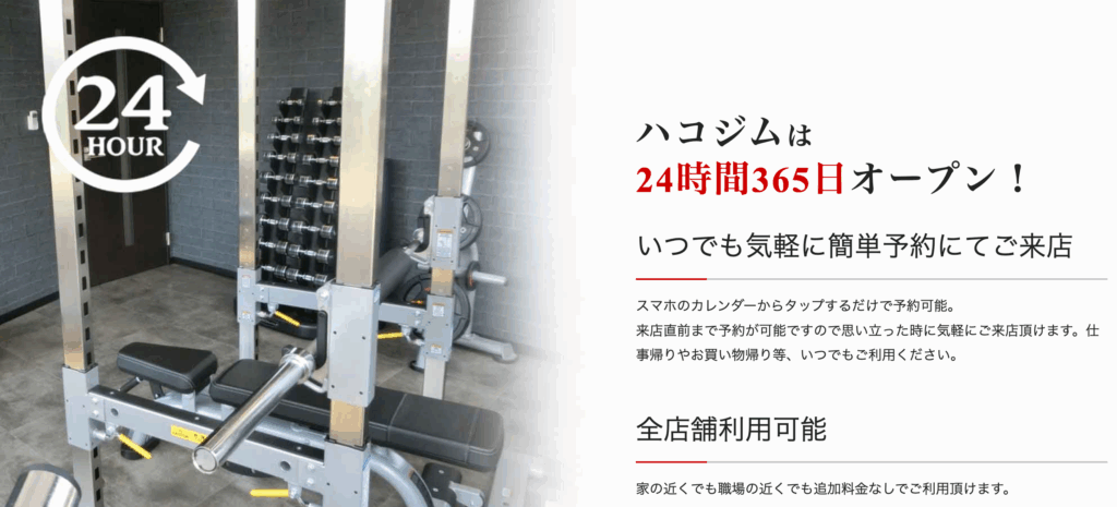 | 2 | ハコジム 高宮店 | 月4回 19,800円〜 | △ | 高宮/24時間 | 半個室セルフトレーニング必要時のみパーソナル | 価格重視/自分のペースで運動したい |