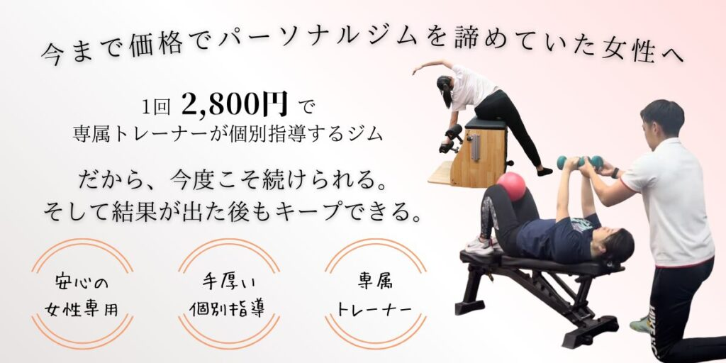 福岡市東区でも トップクラスに料金が安い 女性専用のセミパーソナルジムです。最大3名までの少人数制で、経験豊富なトレーナーが一人ひとりに合わせた個別メニューを作成し丁寧にサポートします。月額14,300円(税込)~と始めやすく、周囲の目を気にせず自分のペースで通えるため、「自己流ダイエットで失敗続き…」という初心者でも安心して挑戦できます。