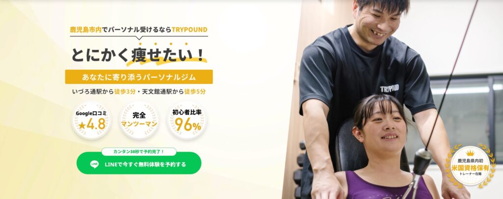TRYPOUNDは、米国認定資格を持つトレーナーが在籍し、本格的なボディメイクやダイエット指導を受けられるジムです。鹿児島天文館店は、天文館通電停から徒歩1分の好立地にあり、