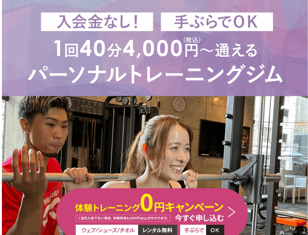 駅近で朝から夜まで営業しているため、忙しい人でも通いやすいのが特徴です。レンタルがあるので手ぶらで通える点は初心者に嬉しいポイントです。価格面でも「まずは安いところから試したい」方の候補になりやすいです。一方で、分数(40分/60分)などプラン設計が複数あるので、目的(ダイエット/筋力UP)に合う枠を選べるかを確認すると安心できます。